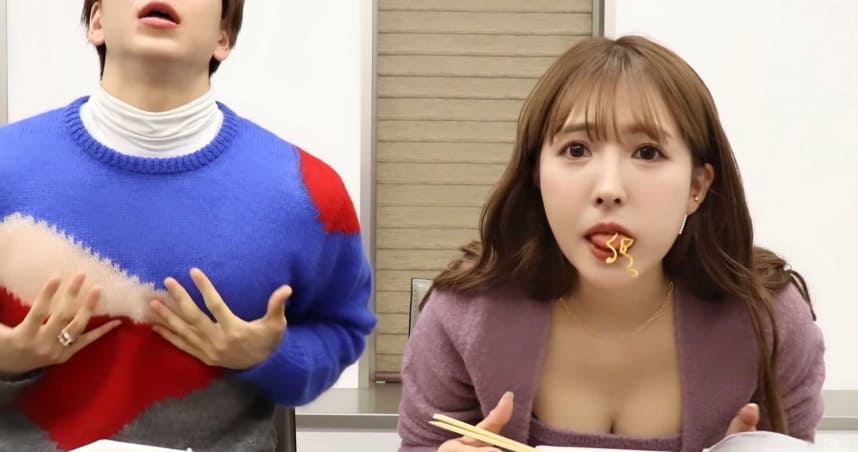 而吃下第一口时,先是经纪人忍不住面的强力辣味而喊叫出来,三上悠亚也是吞下第一口面后,不断的透过拍手转移辛辣带来的疼痛,嘴巴一边喊着「やばい」、「痛い」,一边忍痛将辛辣的泡面吞下肚。