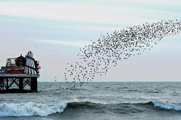 英国一名女子在海边拍摄到数以千计的椋鸟在海面上成群飞行,犹如在海面上起舞,可谓大自然的奇观。