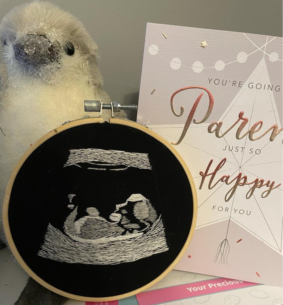 为此,艾玛决定和戴比一起为内森送上一个惊喜。她们参照怀孕12周的超声波扫描照片,花数星期时间手工制成了一幅立体刺绣,看起来跟超声波扫描非常相像。