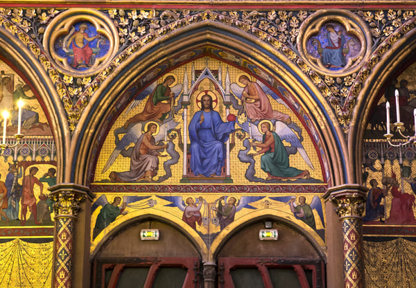 礼拜堂上层只有王室和贵族才可以进入,共有15扇高达15米的彩色玻璃,整体面积达600平方米,巨大的玻璃窗上满是琳琅的色彩和细节丰富的形象,入口中央的门柱上雕刻有耶稣像,门楣上方还有许多惟妙惟肖的宗教人物。西边玫瑰花窗下的绘画,精美绝伦。