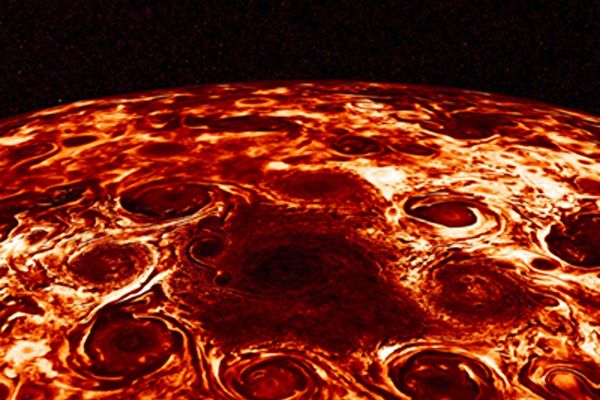这颗行星上的一圈圈红色漩涡实际上是木星北极的旋风,照片较亮的地方温度较高,较暗的地方温度较低,看上去的确像是香肠披萨的高分辨率图像。