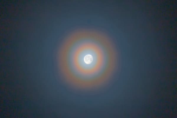 大自然总是神奇地创造出一些令人叹为观止的景观,一位意大利摄影师近日意外拍摄到极为罕见的“月华”奇景,月亮被一圈彩虹般的光圈围绕着,照片分享到网上后吸引众多网友转发,纷纷大赞“太美了!”