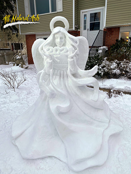 两位雕塑家用雪塑造了一个真人般大小的天使。(Andy Gertler和Sue Beatrice提供)
