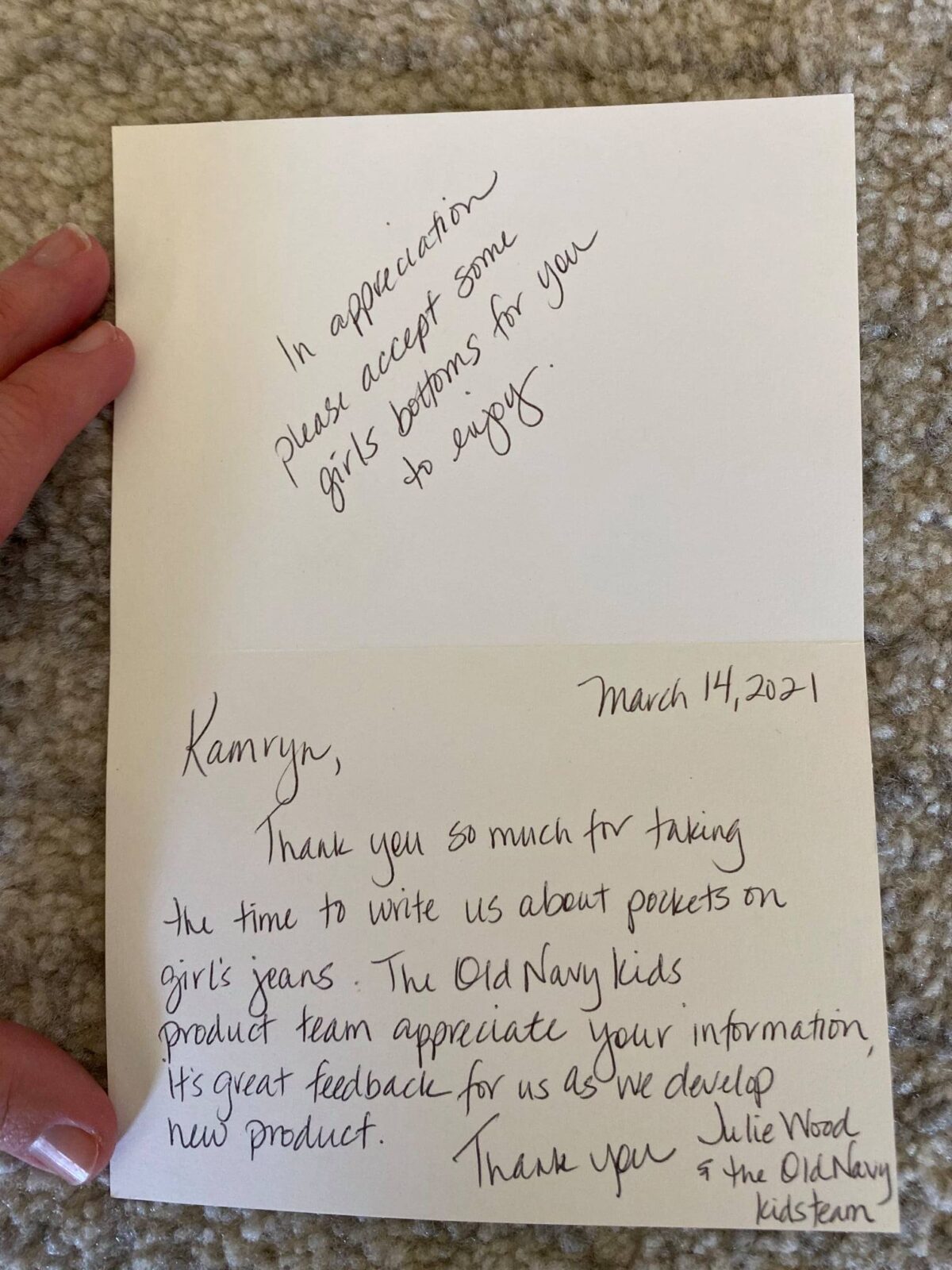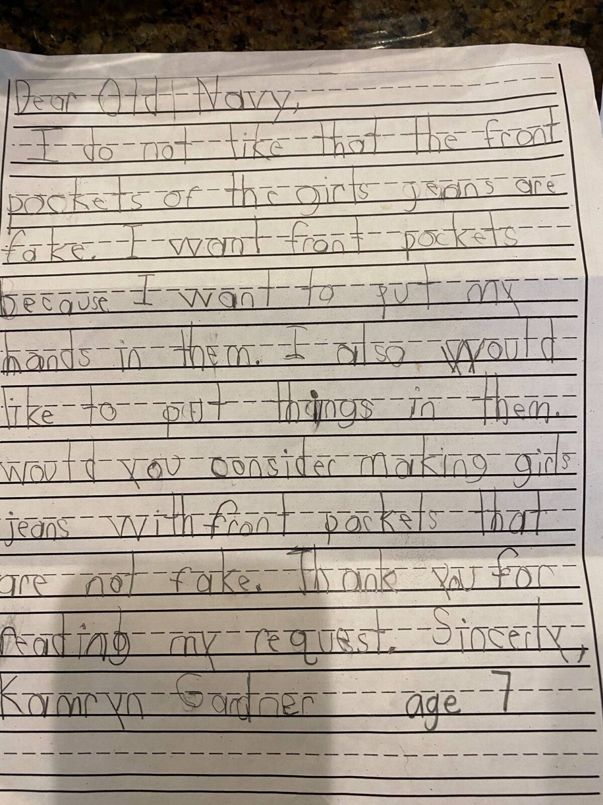 “亲爱的老海军(Old Navy),我不喜欢女童牛仔裤的前口袋是假的”,她写道,“我想要真的前口袋,因为我想把手放进去,我也想把一些东西放进去。”