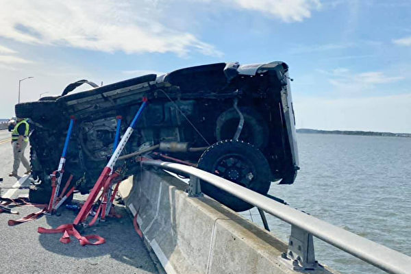 消防人员用工具把冲上桥边护栏的货车固定住,以防其坠入海中。(大洋城消防局提供)