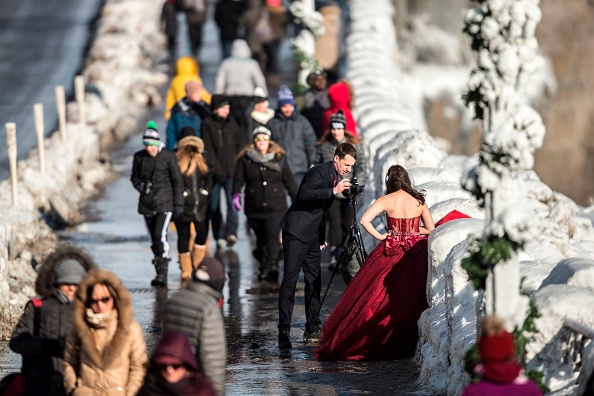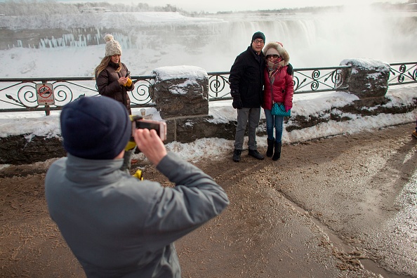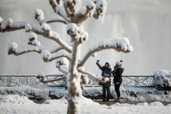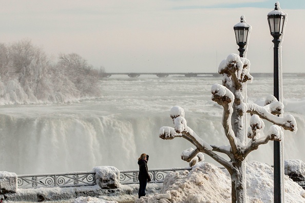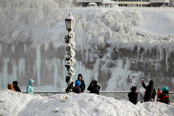 2018年1月3日,尼亚加拉大瀑布出现冰封奇观,吸引民众冒着严寒前来拍摄美景。(AFP PHOTO / Geoff Robins)