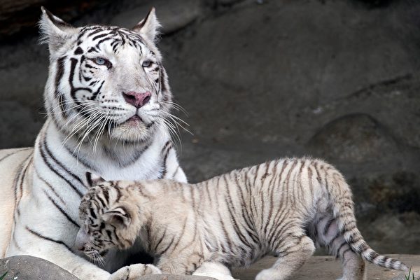 在库玛和奈莎所生的三只幼虎中,有一只是与众不同的白虎。虽然与其他幼虎的“肤色”不同,但它还是一样健康,也一样爱玩。