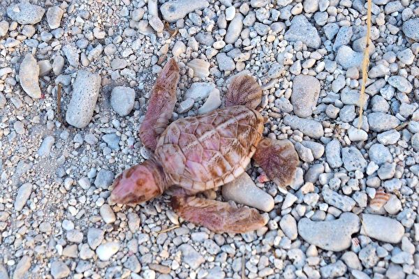 澳大利亚海滩近期发现一只稀有的白化海龟幼崽,由于体表色素沉着不足,这只海龟呈现罕见的粉红色。(Jessica Buckman提供)