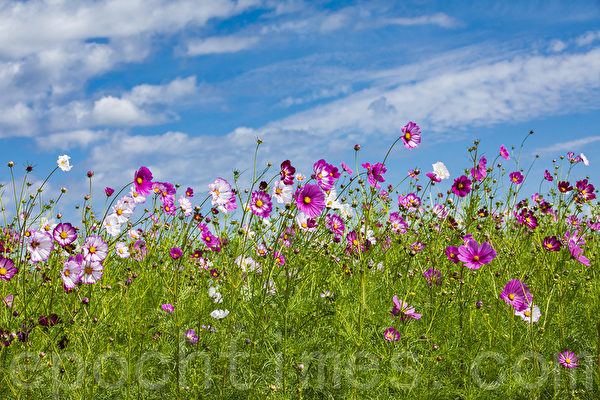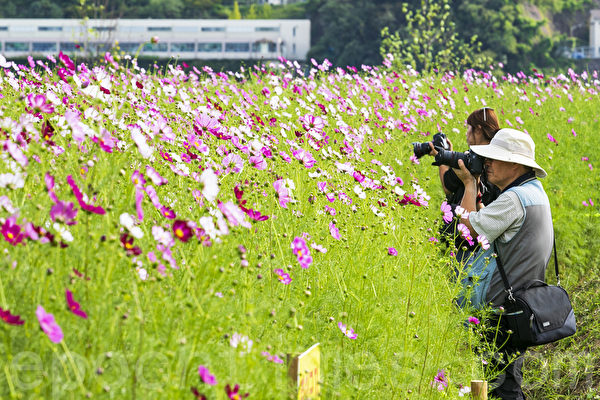 韩国京畿道九里汉江公园的波斯菊开花,美丽风景吸引游客前来观赏。(全景林/媒体)
