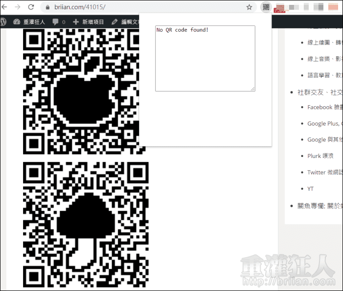 不过网页中若有两个以上的 QR Code 就会无法成功读取,某些设计太过花俏的,也有可能会读取失败,一般常见的黑白 QR Code 基本上是没有问题的,有需要的朋友可以参考看看啰!