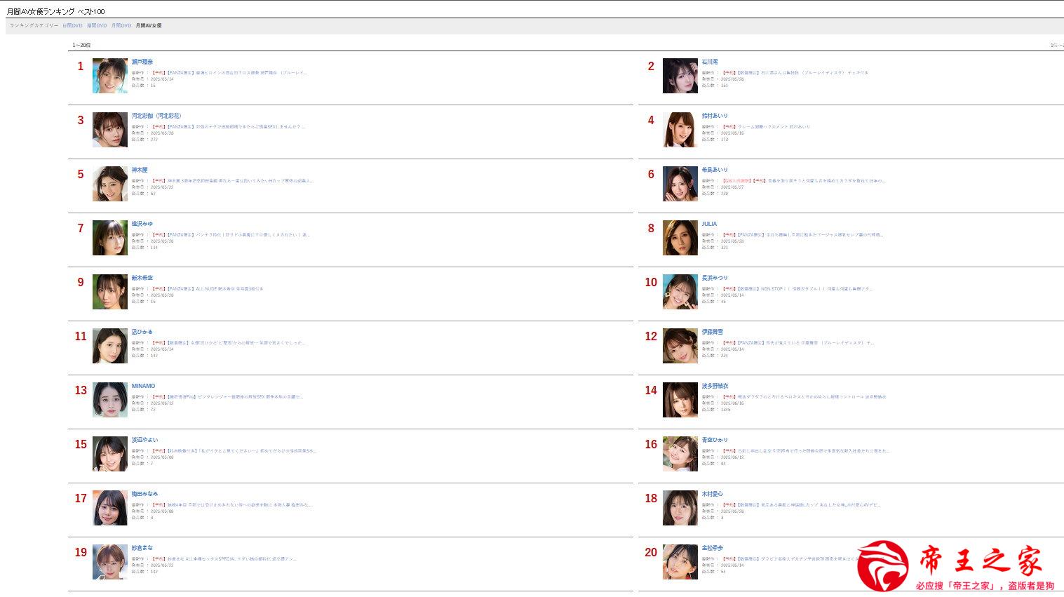 2025年FANZA《4月AV女优作品销售TOP10》,最强新人持续霸榜!