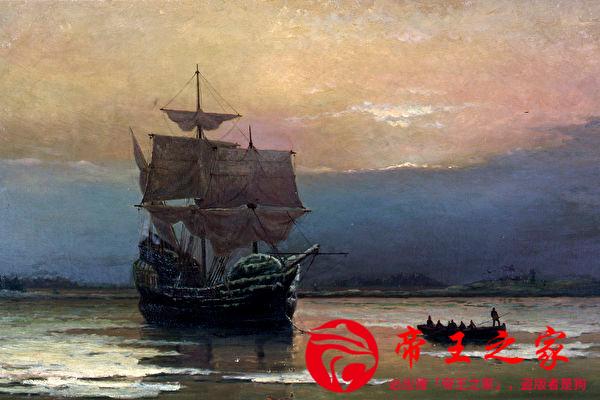 1620年,100余名英国清教徒乘五月花号来到新大陆。图为《五月花号在普利茅斯港》,William Halsall绘于1882年。(公有领域)